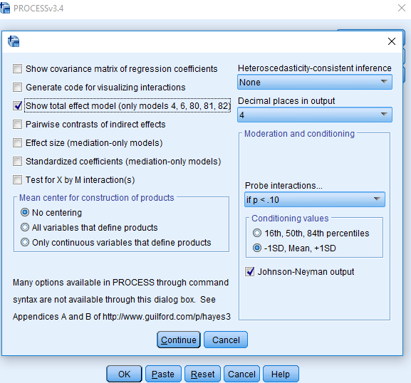 저는 이렇게 세팅했어요. 참고로 probe interactions을 좀 건들였는데, (Johnson-Neyman output에 체크를 하는 등) 이건 조절 효과를 볼 때 의미가 있고, 매개 모델에서는 의미가 없어요. 참고하세요~