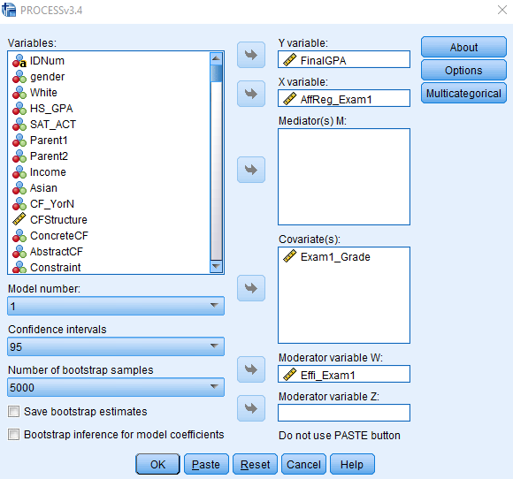 이 모델로 우리는 학생들의 후회가 최종 성적에 미치는 영향이 자기 효능감에 따라 다른지 볼 수 있겠죠.