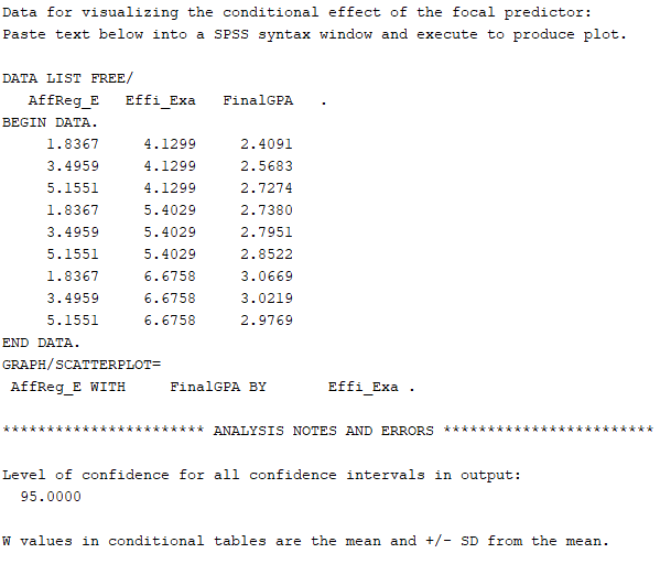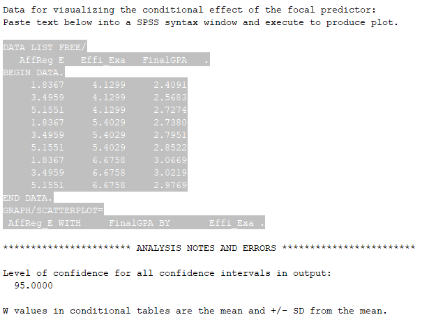 그 아래 긴 리스트는 JN output인데, 이건 독립변수랑 종속변수간의 관계 변화를 조절변수 관점에서 보여주는 거예요.