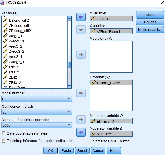 조절변수1은 Moderator variable W에, 조절변수2는 Moderator variable Z에, 그리고 모델 넘버를 2로 바꿔주고요.