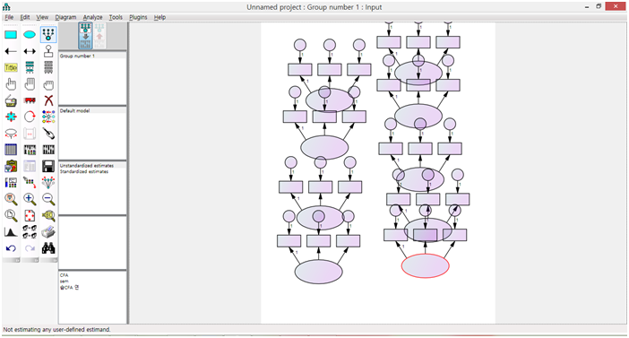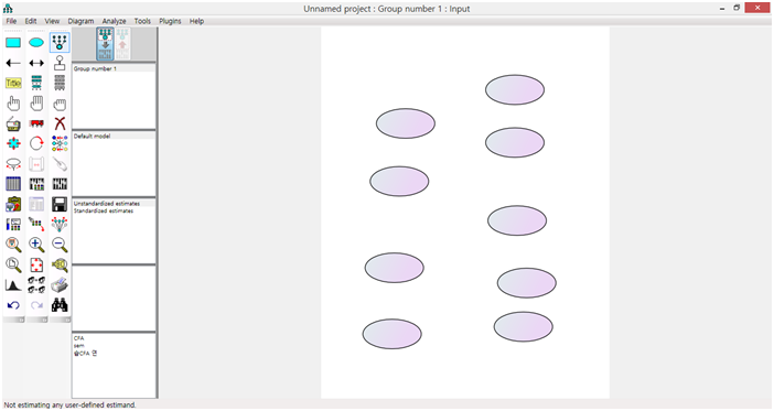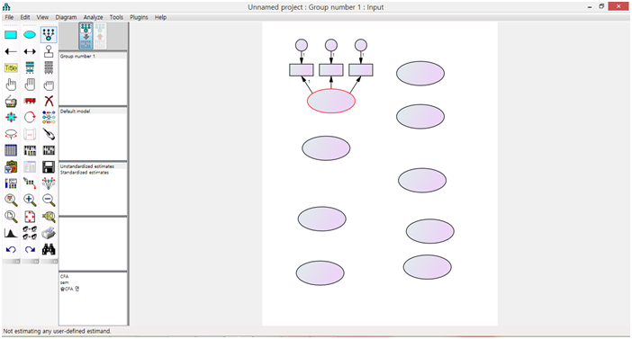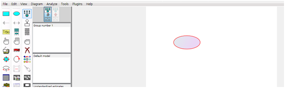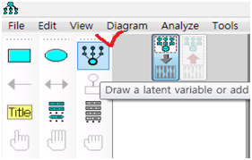 구조방정식 관련 책을 보시면 저 세 개의 아이콘 중에 가운데 동그라미 아이콘을 눌러서 그림을 그리라고 하는데, 제일 처음 한 번만 동그라미 아이콘을 이용해 그려주시고, 두 번째 동그라미 부터는 아래에 v 체크가 되어 있는 오른쪽 아이콘을 눌러서 오른쪽 공백에 클릭 해주시면 되요.