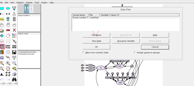 Amos에 들어오는 여러가지 방법이 있는데, 한 가지는 SPSS를 통해서 들어오는 거예요. Amos를 설치하시면 분석(analysis) 탭 가장 아래 Amos가 생기거든요. 그러면 SPSS상에 떠 있던 데이터가 자동으로 Amos에 연동이 돼요. 하지만 다른 방법으로 들어 오셨다면, 여기서 데이터 파일을 불러와야해요.