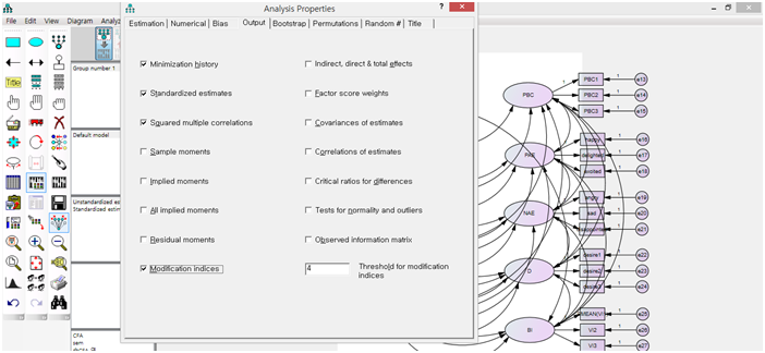 이런 창이 떠요. 아직은 기초 과정이니 다른건 건들지 마시고 바로 Output 탭으로 가세요. 만약 결측치가 있다면 Estimate means and intercepts를 체크해주세요.