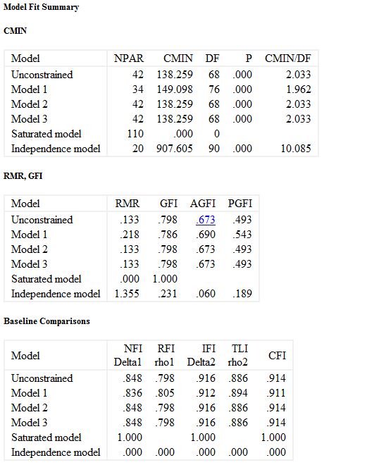 아무 제약 없이 분석한 모델(unconstrained)과 제약을 준 모델(Model 1)의 모델 핏에 별반 차이가 없어요.