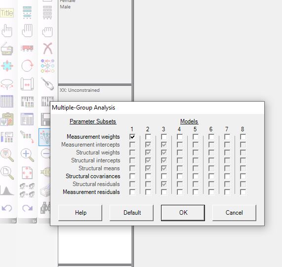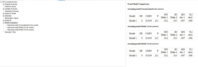 Mplus라면 여기서 strong factorial invariance 단계로 가겠지만 Amos에서는 여기까지만 하면 될 것 같아요.