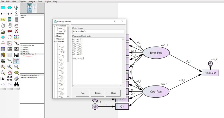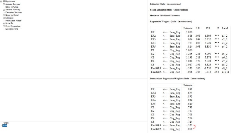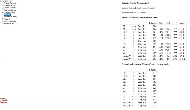 모형 그림을 보면 Emo_Reg -> FinalGPA 경로가 a9_1인거 보이시나요? 지금 female을 선택해놓았기 때문에 이 경로가 a9_1인거고 male을 선택하면 이 경로는 a9_2가 되는걸 확인할 수 있을거예요.