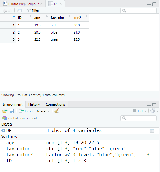 그럼 아래와 같이 데이터 프레임 안에 새로운 object인 age2가 생기고 이 안의 값은 기존 age 안에 있던 값의 +1이 된 값이 저장이돼요.